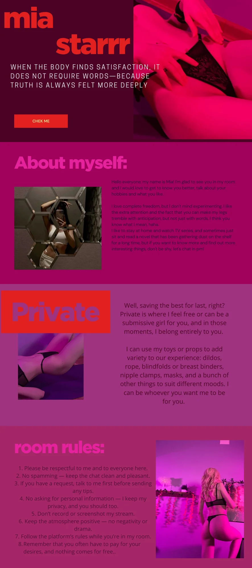 Dış Mekan, Konuşmalı, Elle Muamele, Meme Ucu Oyuncakları, Masaj, Aşağılama, Ayak Fetişi, Yutma, Yüze Boşalma, Göğüs Sikme, Rol Oyunu, Seks Oyuncakları, Fışkırtma, Striptiz